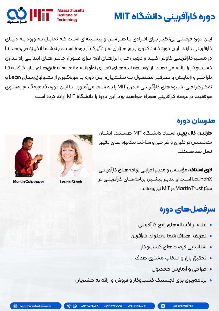 دوره کارآفرینی MIT، هماکنون در آکادمی آموزشهای بینالمللی فرا مدرک به زبان فارسی ارائه شده است.