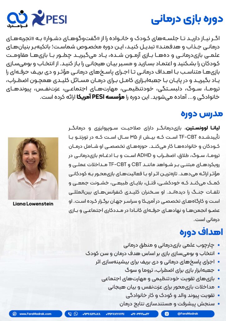 لیانا لوونستین، بازیدرمانگر دارای صلاحیت سوپروایزری و درمانگر تأییدشده TF-CBT است که بیش از ۳۵ سال است که در تورنتو با کودکان و خانوادهها کار میکند. حوزههای تخصصی او شامل درمان تروما، سوگ، طلاق، اضطراب و ADHD است و با ادغام بازیدرمانی در رویکردهای مبتنی بر شواهد مانند CBT و TF-CBT مداخلات عملی و مؤثر ارائه میدهد. افزون بر کار بالینی به درمانگران سلامت روان، سوپروایزری و مشاوره میدهد.