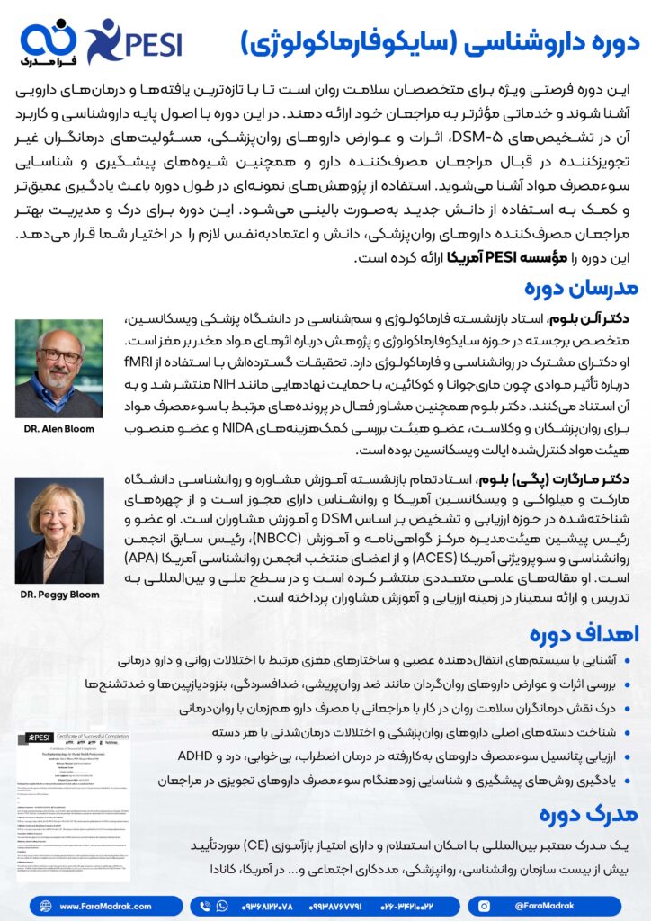 دورۀ داروشناسی برای روانشناسان (سایکوفارماکولوژی)، هماکنون در آکادمی آموزشهای بینالمللی فرا مدرک به زبان فارسی ارائه شده است.