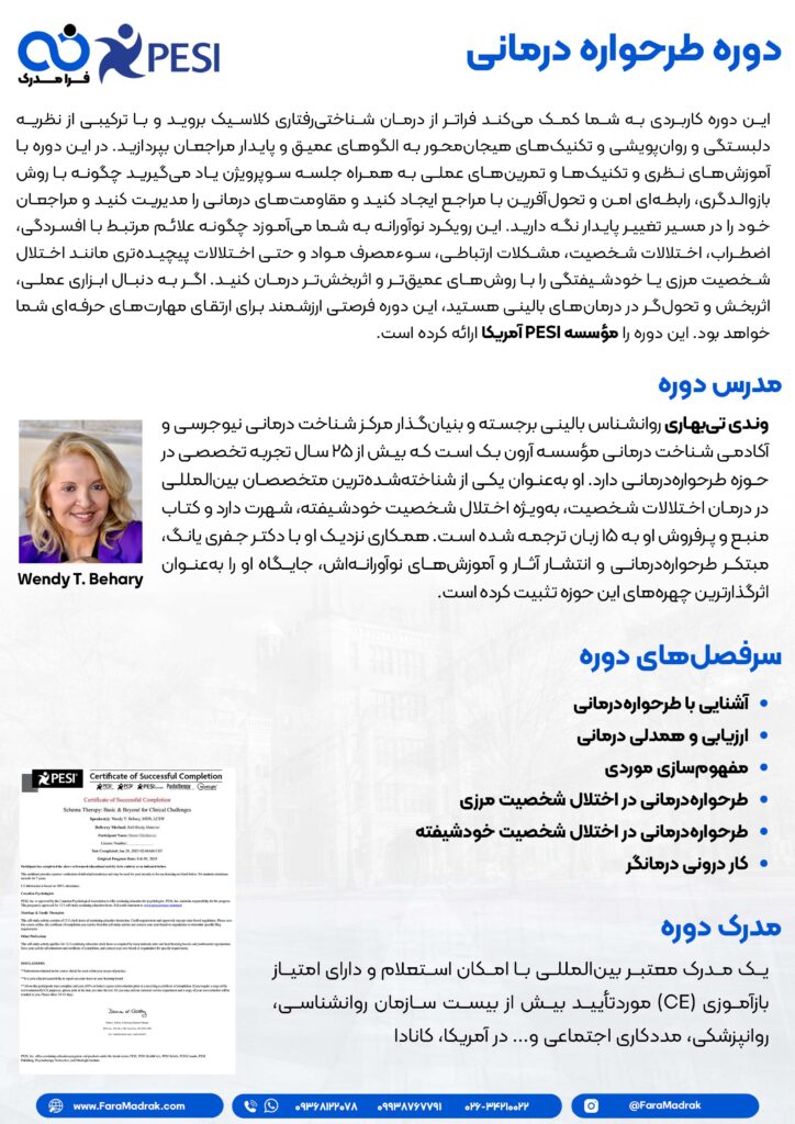 دوره طرحواره درمانی دارای مدرک معتبر بینالمللی از موسسه pesi میباشد و مدرک داخلی وزارت علوم ندارد.