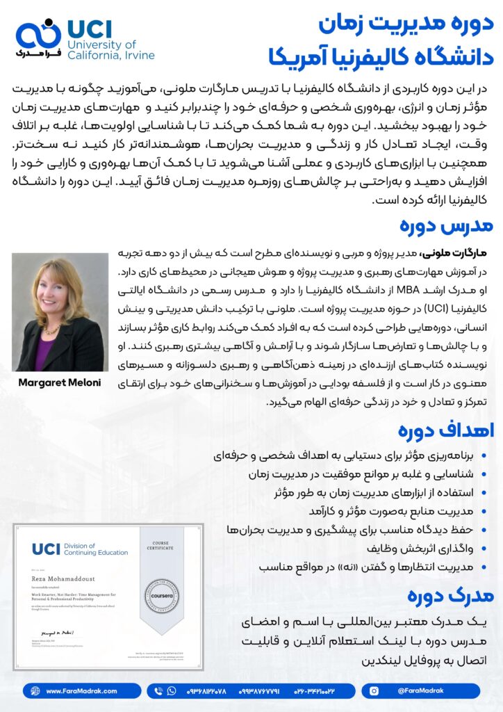 دوره مدیریت زمان دانشگاه کالیفرنیا دارای چهار هفته آموزشی و به صورت آفلاین با زیرنویس فارسی میباشد. شما میتوانید برای تهیه این دوره به آکادمی بینالمللی فرامدرک (https://faramadrak.com) مراجعه کنید یا با کارشناسان ما در واتس اپ تماس بگیرید.